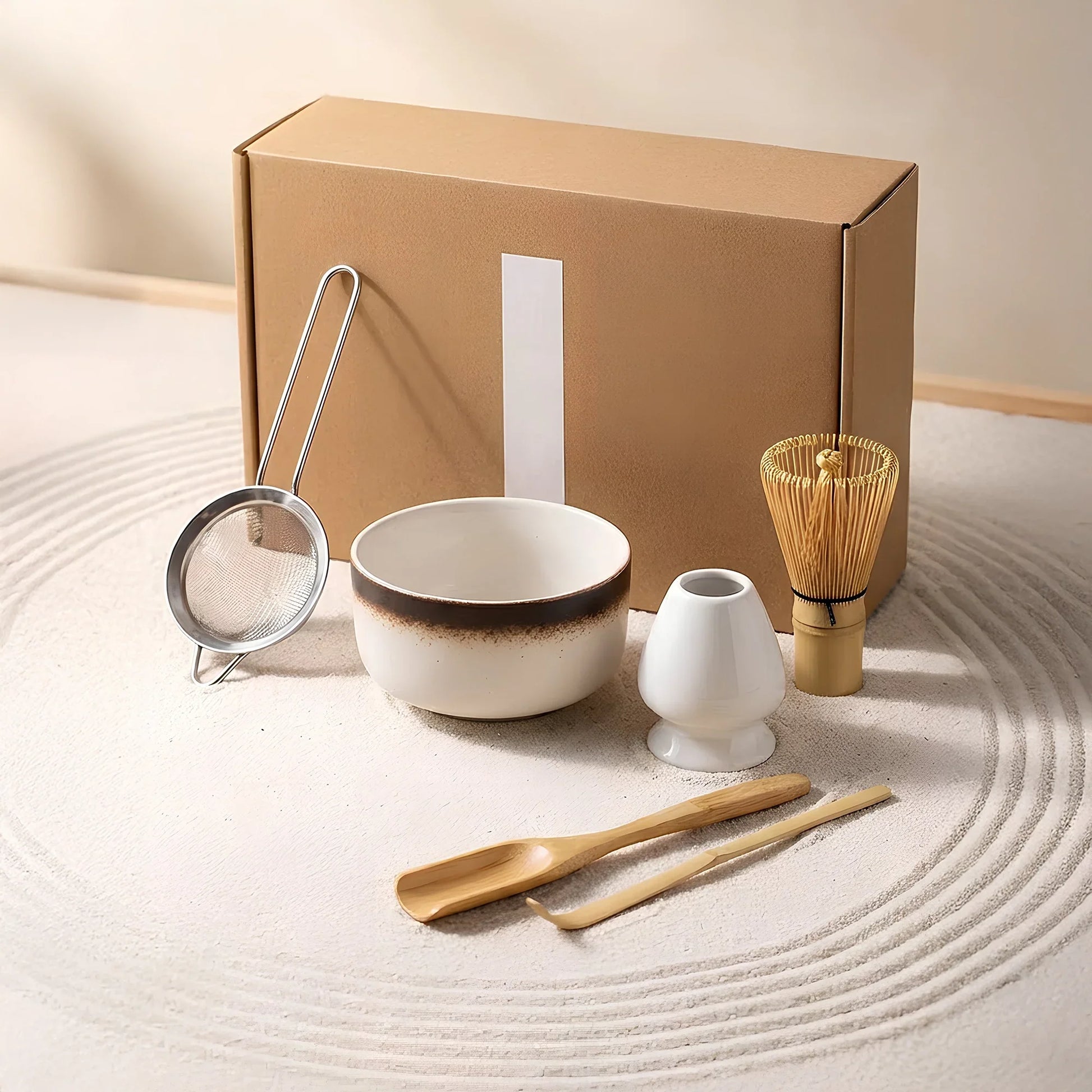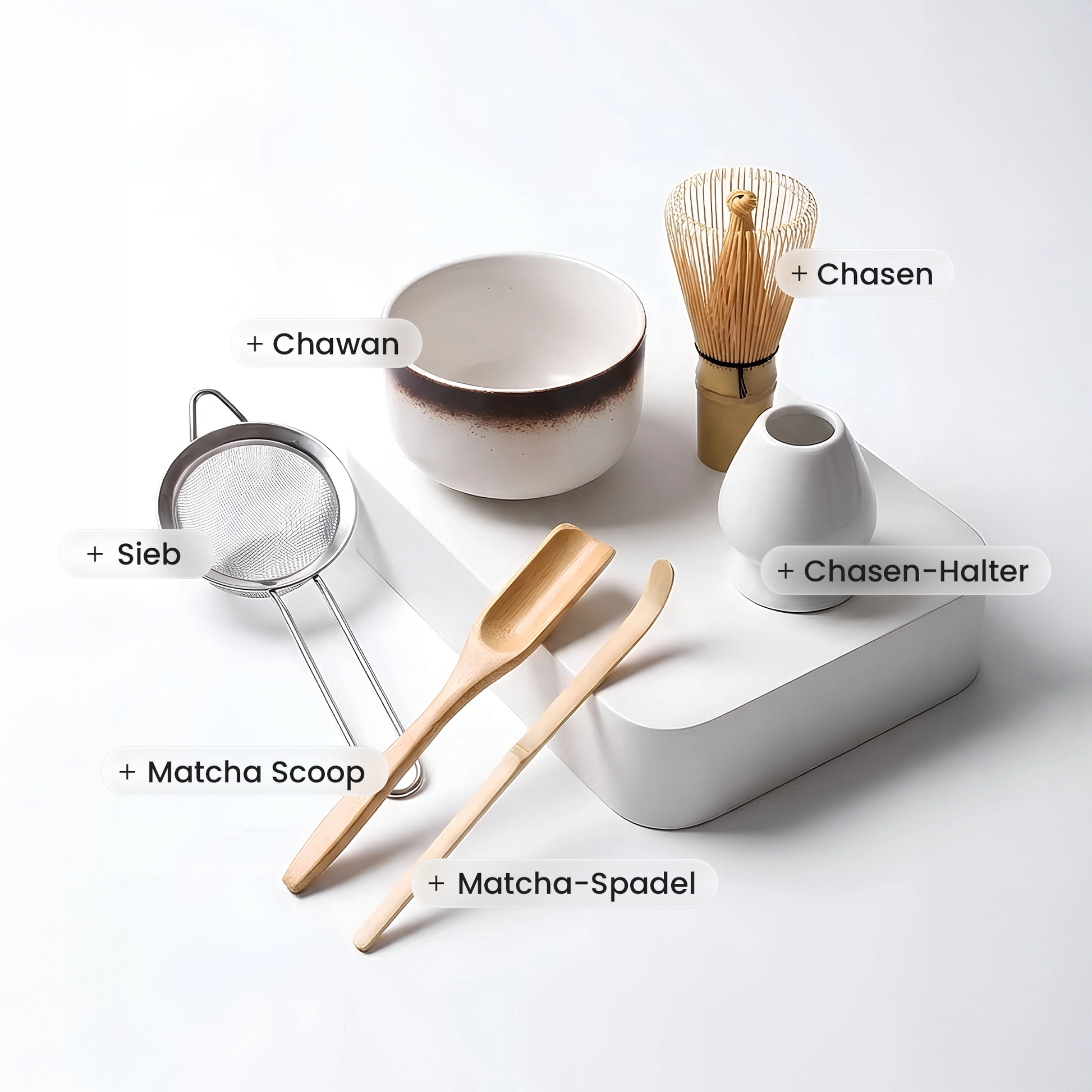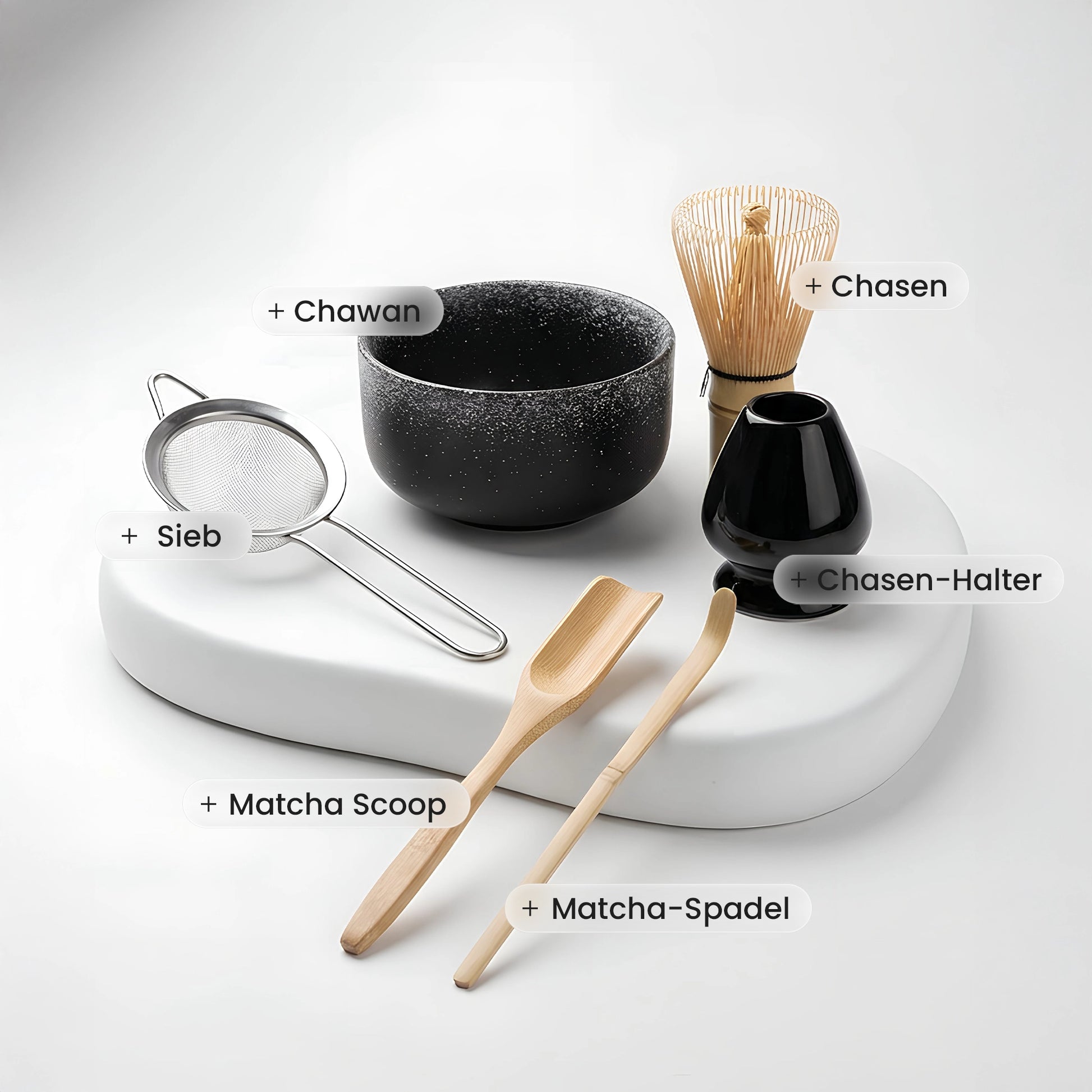 Komplettes Set: Chawan, Chasen, Chasen-Halter, Feinsieb, Matcha-Scoop & Matcha-Spatel – alles, was du brauchst.
